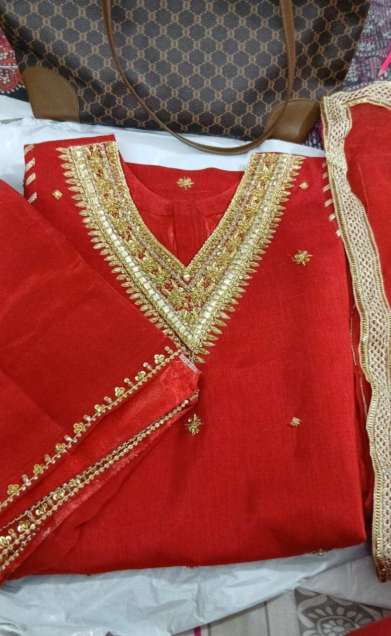 Description: Korean-Raw Silk shirt is adorned with exquisite tila embroidery and adda work is a testament to craftsmanship. Paired with a silk straight pant featuring adda borders this ensemble is a symphony of grace and tradition