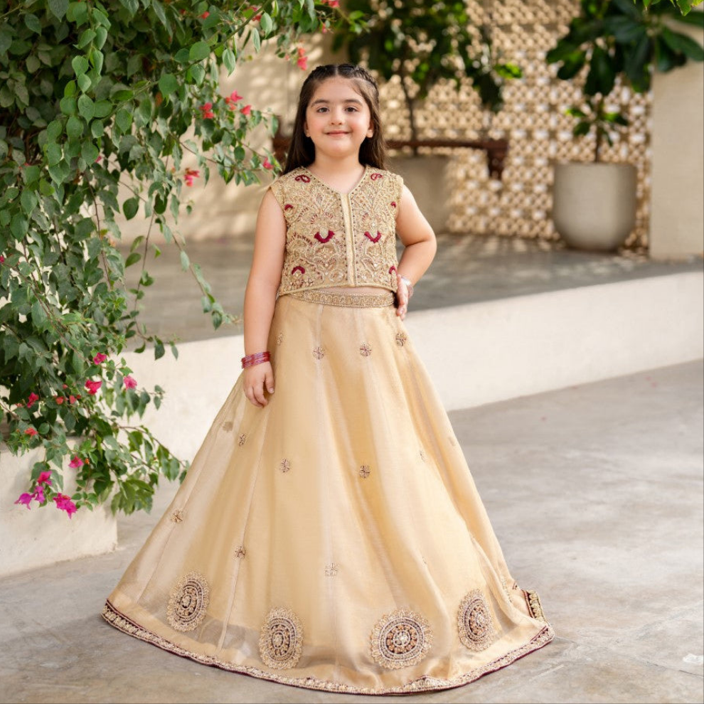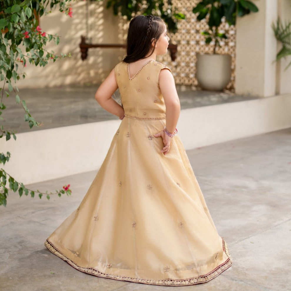 This elegant handmade dress features a rich gold tone, beautifully paired with a heavily embroidered bodice in gold and maroon threadwork. while the flared skirt is decorated with delicate embellishments and intricate circular patterns along the border. A perfect choice for festive occasions and wedding celebrations, this dress blends timeless tradition with graceful charm.