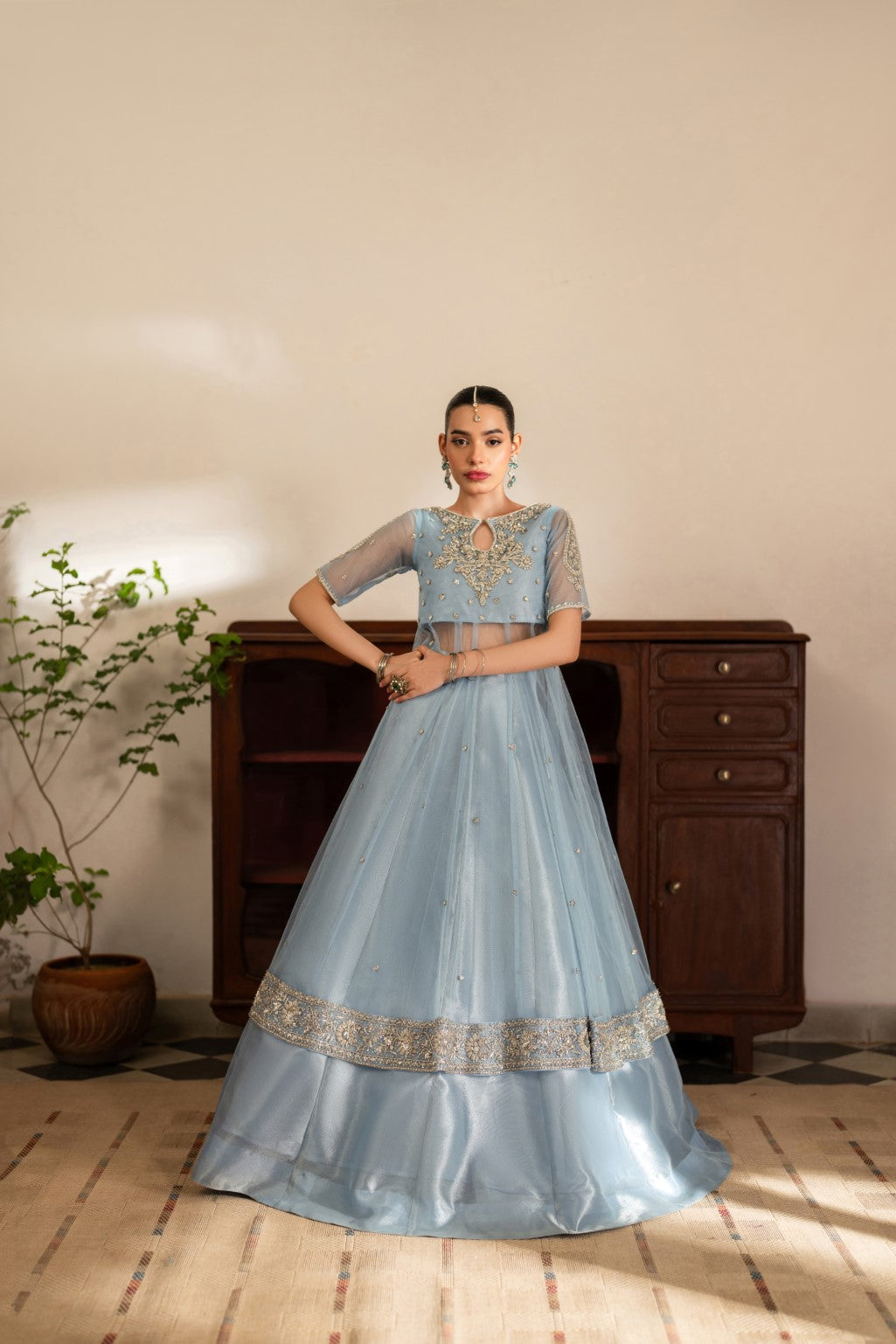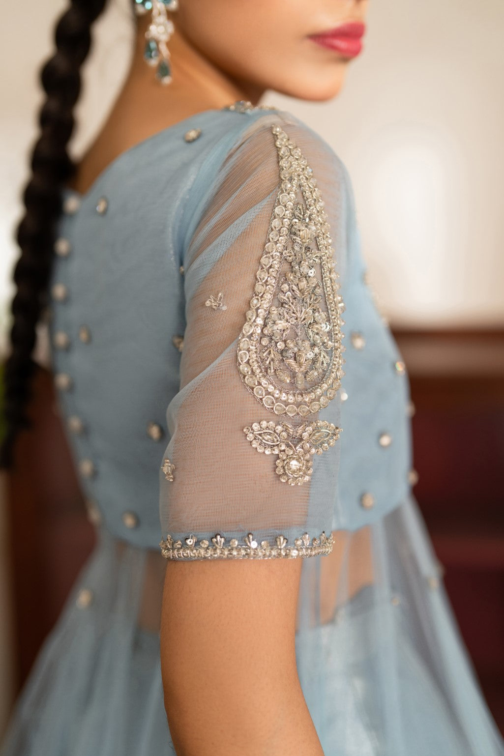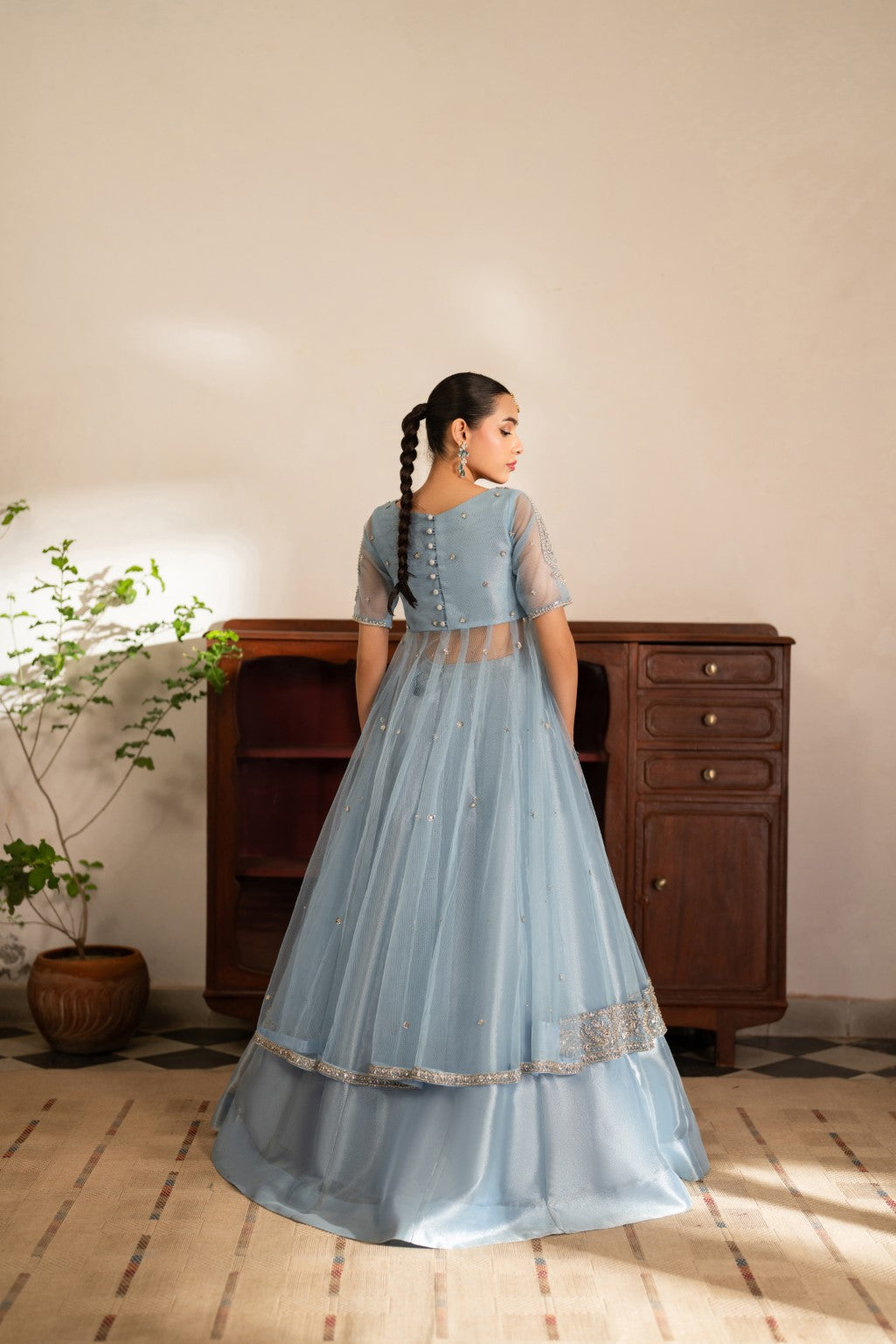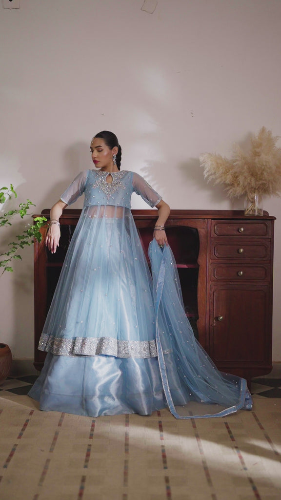 Step into your very own fairytale with this ethereal Elsa blue gown, paired with a flowy tissue lehenga. Designed in a soft icy hue, the gown features delicate tailoring and hand embellishments that shimmer like frosty magic. The lightweight tissue lehenga adds just the right amount of volume and regal charm, while keeping the silhouette graceful and comfortable.