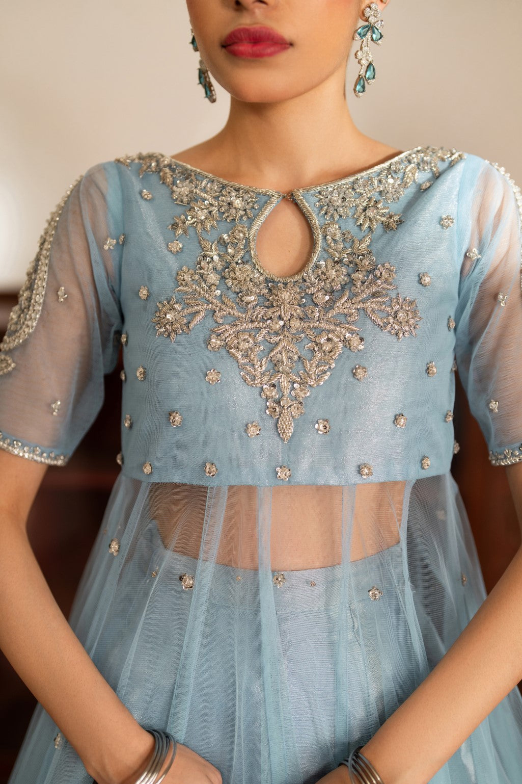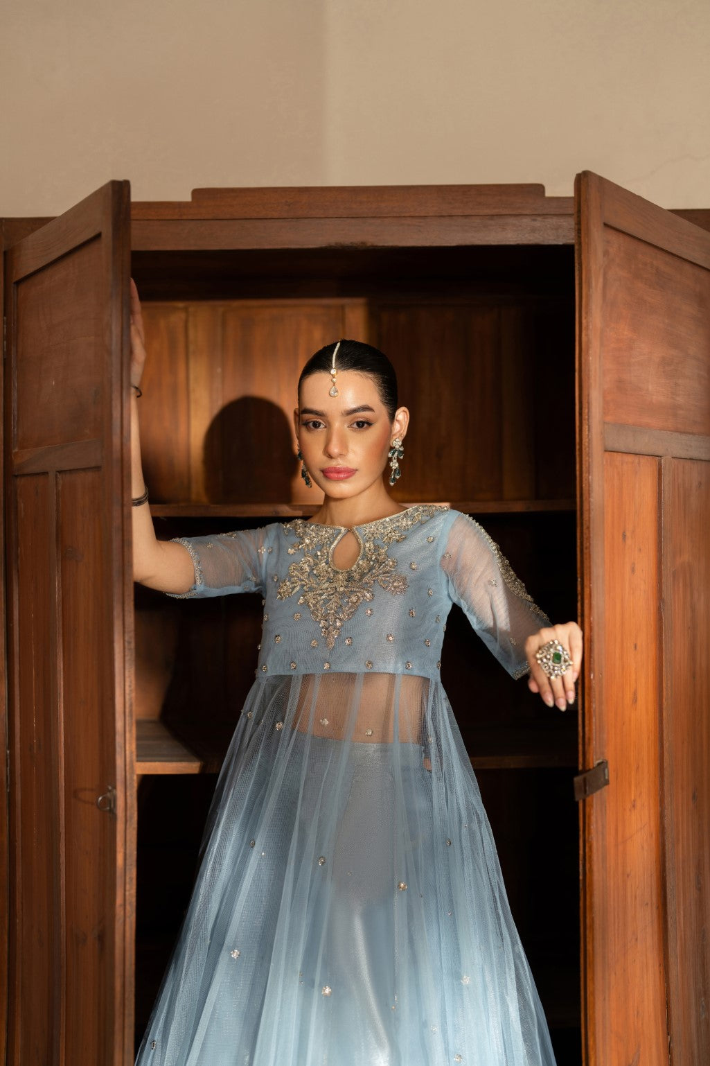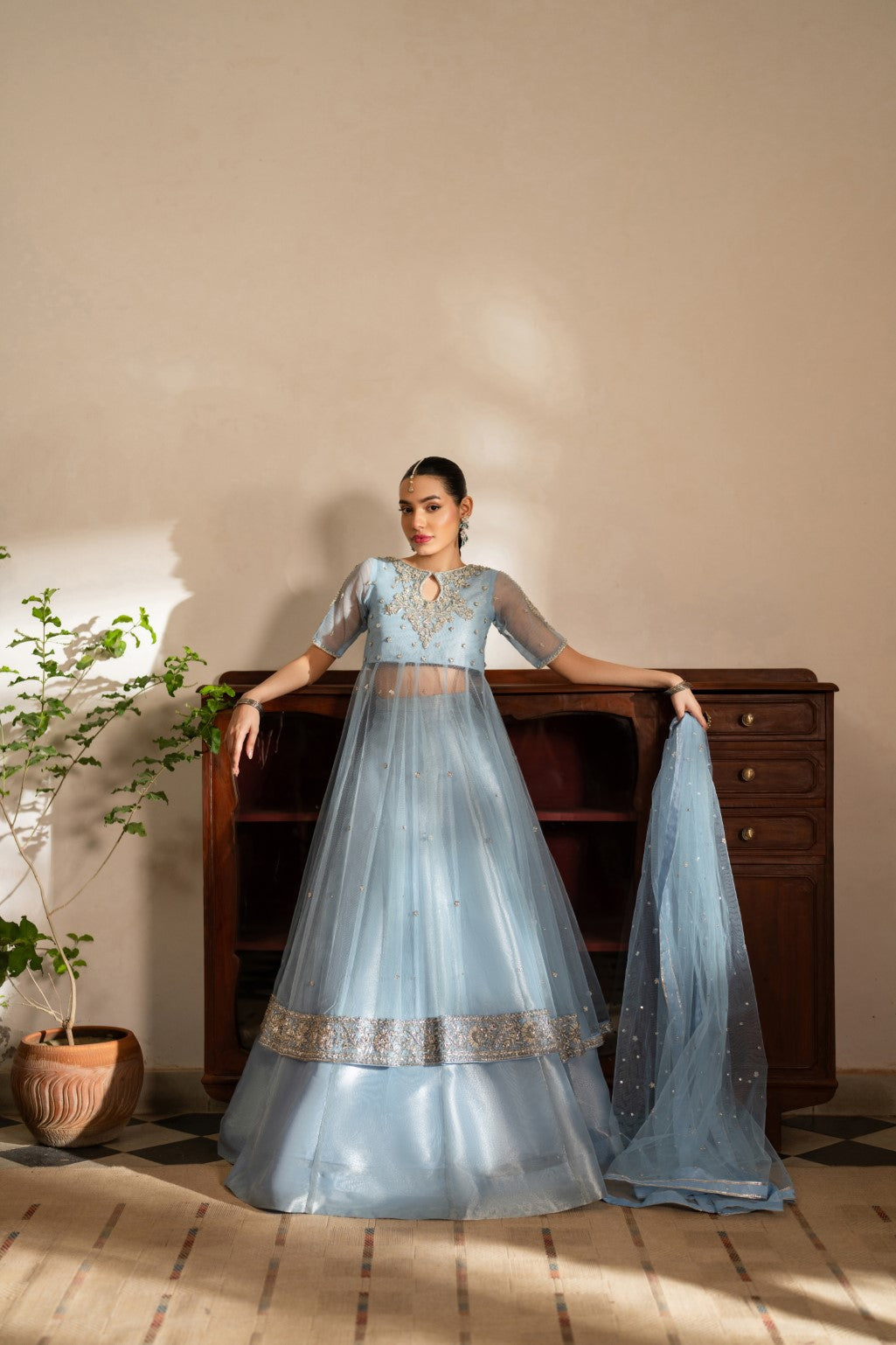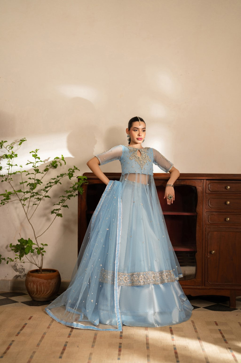 Step into your very own fairytale with this ethereal Elsa blue gown, paired with a flowy tissue lehenga. Designed in a soft icy hue, the gown features delicate tailoring and hand embellishments that shimmer like frosty magic. The lightweight tissue lehenga adds just the right amount of volume and regal charm, while keeping the silhouette graceful and comfortable.