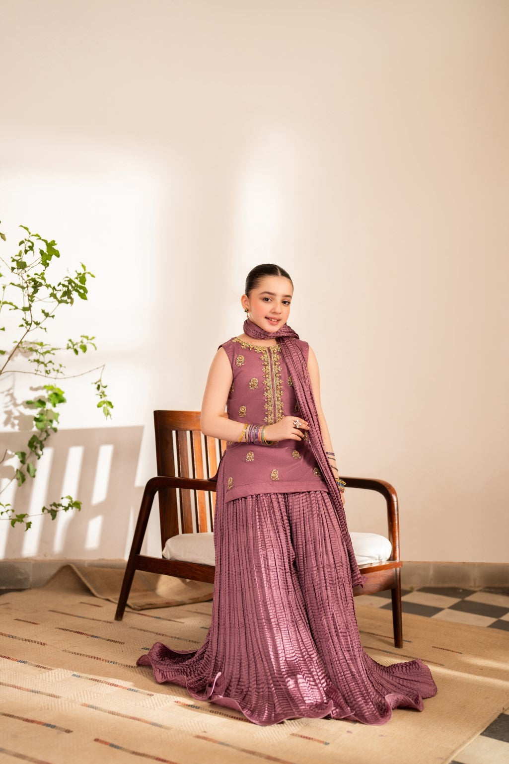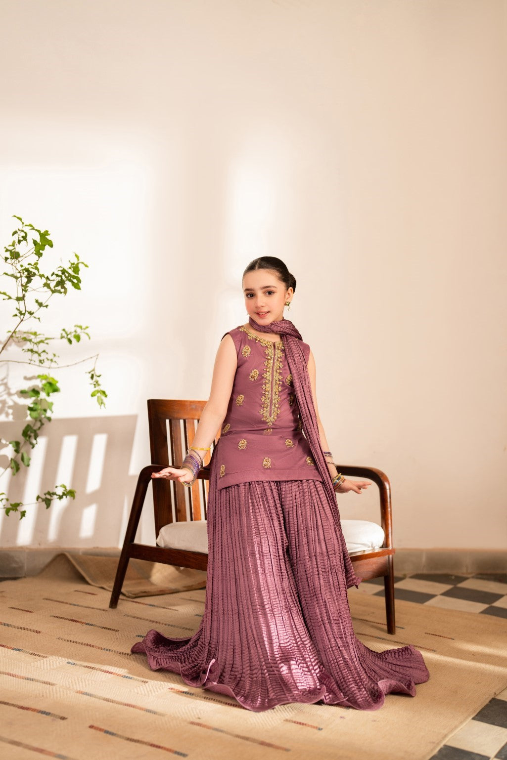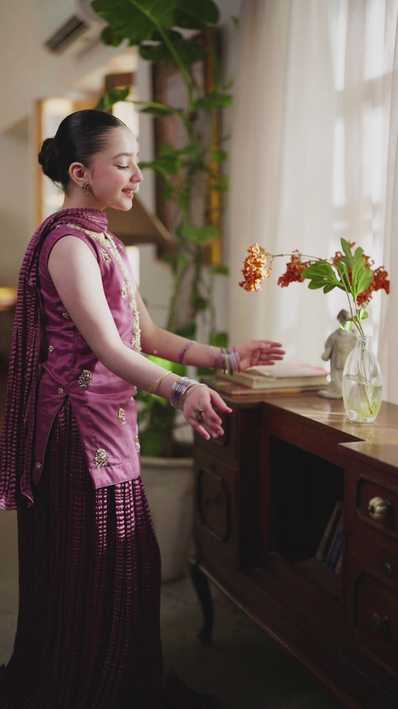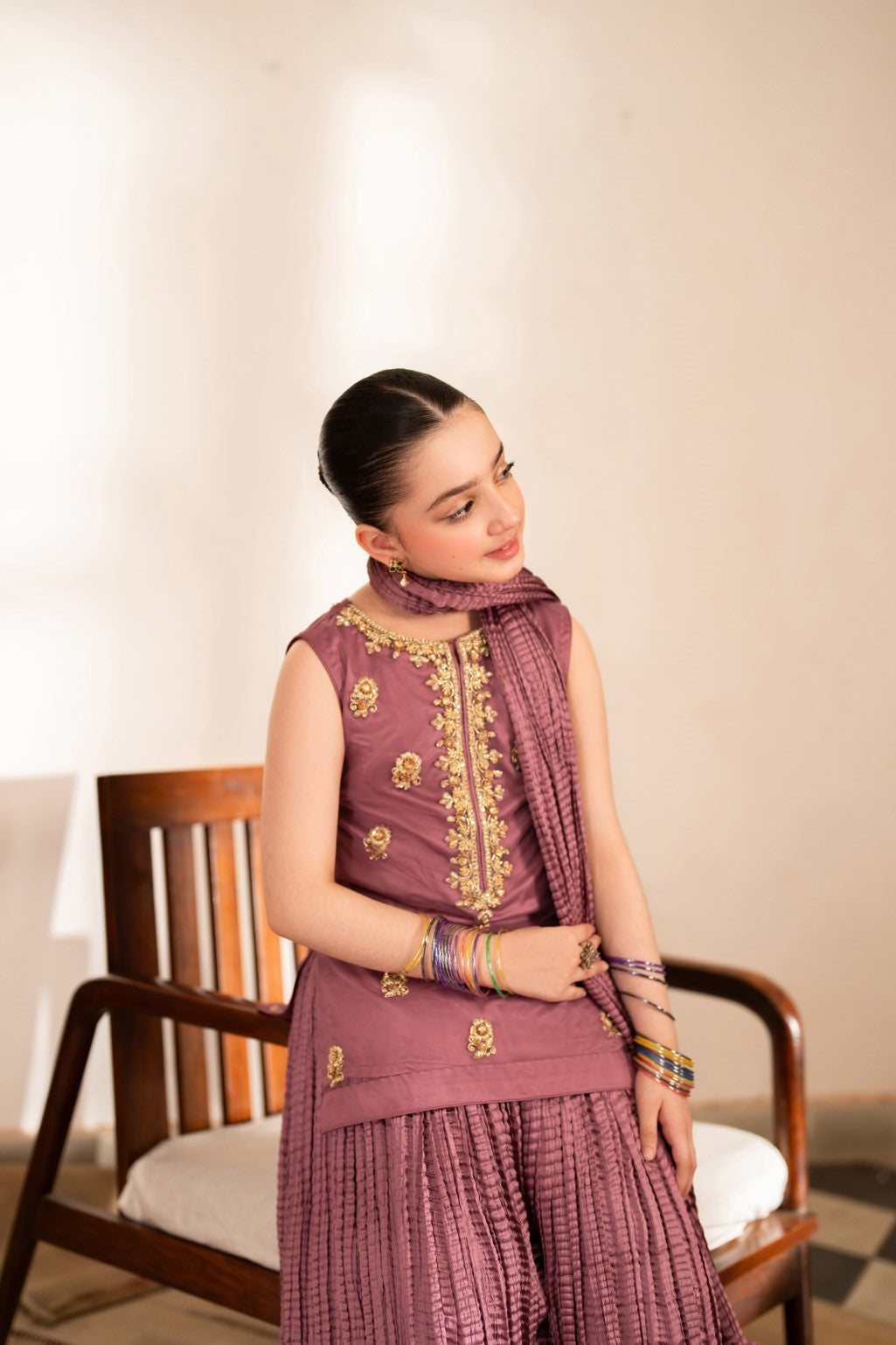 Meet ZEHRA – a dreamy mauve beauty made to turn heads at every festive gathering. Adorned with gold embroidery and delicate dabka, the floral and paisley patterns give it that perfect regal touch. The flowy sharara adds just the right amount of grace, striking a balance between modern flair and traditional charm. Complete with a matching dupatta, this outfit is all about effortless elegance with a soft, flowy finish.