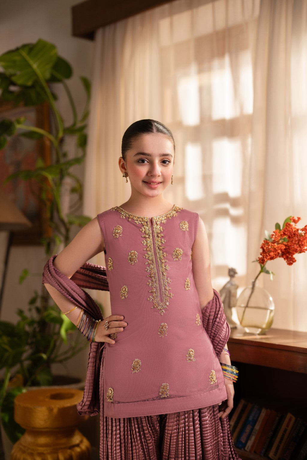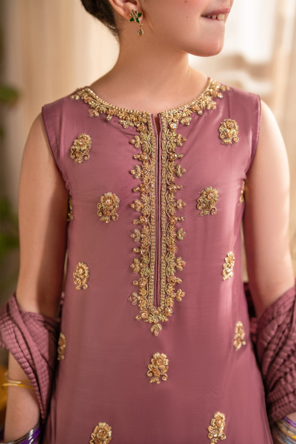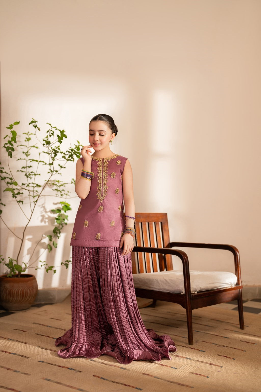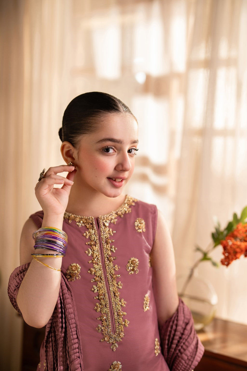 Meet ZEHRA – a dreamy mauve beauty made to turn heads at every festive gathering. Adorned with gold embroidery and delicate dabka, the floral and paisley patterns give it that perfect regal touch. The flowy sharara adds just the right amount of grace, striking a balance between modern flair and traditional charm. Complete with a matching dupatta, this outfit is all about effortless elegance with a soft, flowy finish.
